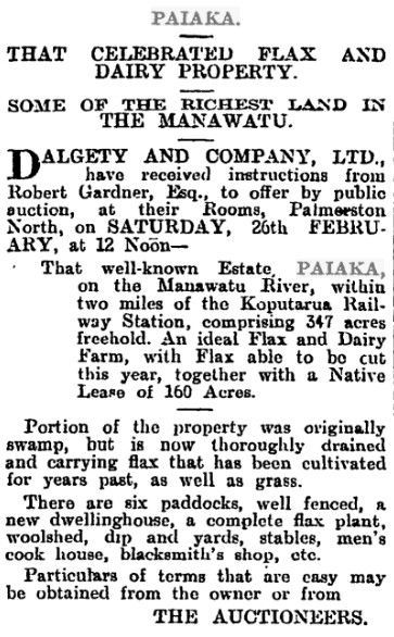 That well-known estate, PAIAKA, on the Manawatu River, within two miles of the Koputaroa Railway Station, comprising 347 acres freehold. An ideal Flax and Dairy Farm, with Flax able to be cut this year, together with a Native Lease of 160 acres.