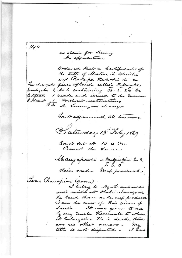 This land belonged to Taumanu formerly. This land was allotted to her brother and her and he has gone to the Hauhaus – not to fight. He is at Rangitikei. Wiremu te Rangiauaki is the brothers name. They have both land elsewhere. No opposition.