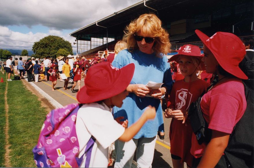 St Joseph’s students with an adult supporter at the Primary Schools Athletics meeting at the Courtesy Ford Domain held on 15th March 2000