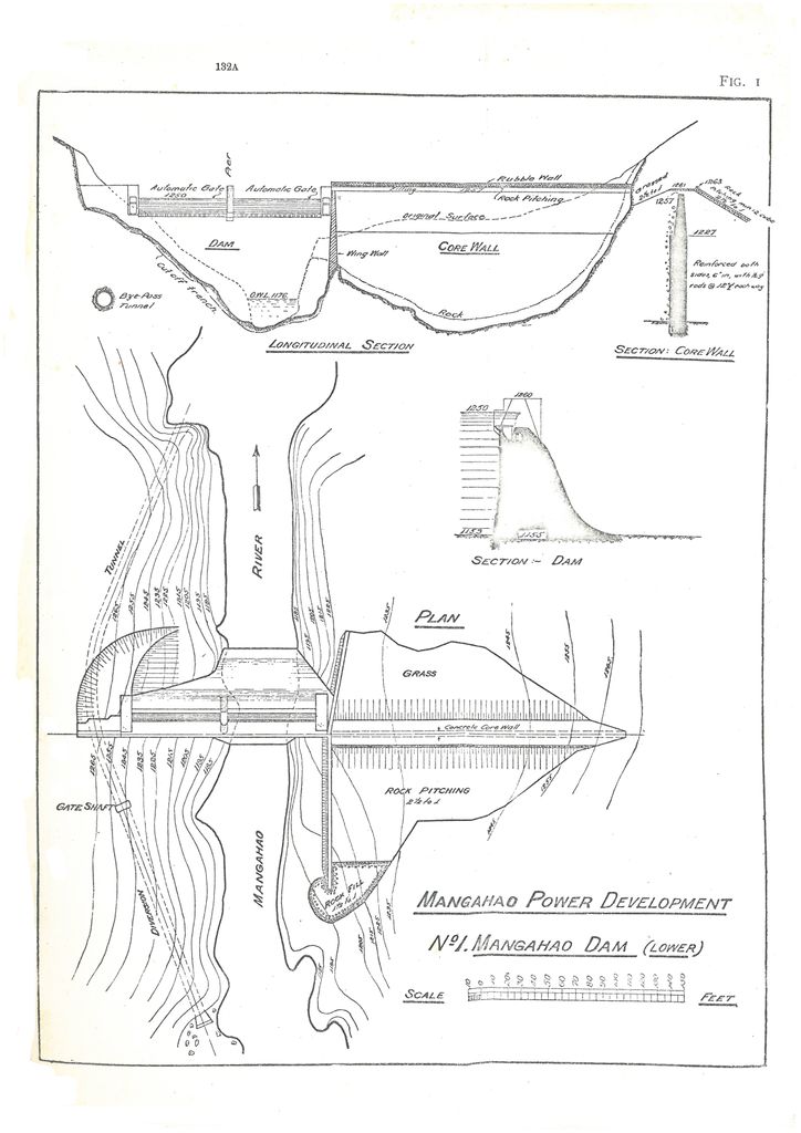 Plan of the Mangahao No. 1 dam (lower) including longitudinal cross sections.