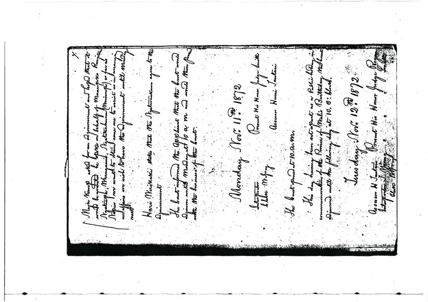 This day having been set apart as a Public Holiday in commemoration of the Prince of Wales Birthday the Court adjourned to the following day at 10 o’clock.Tuesday Nov. 12th 1872