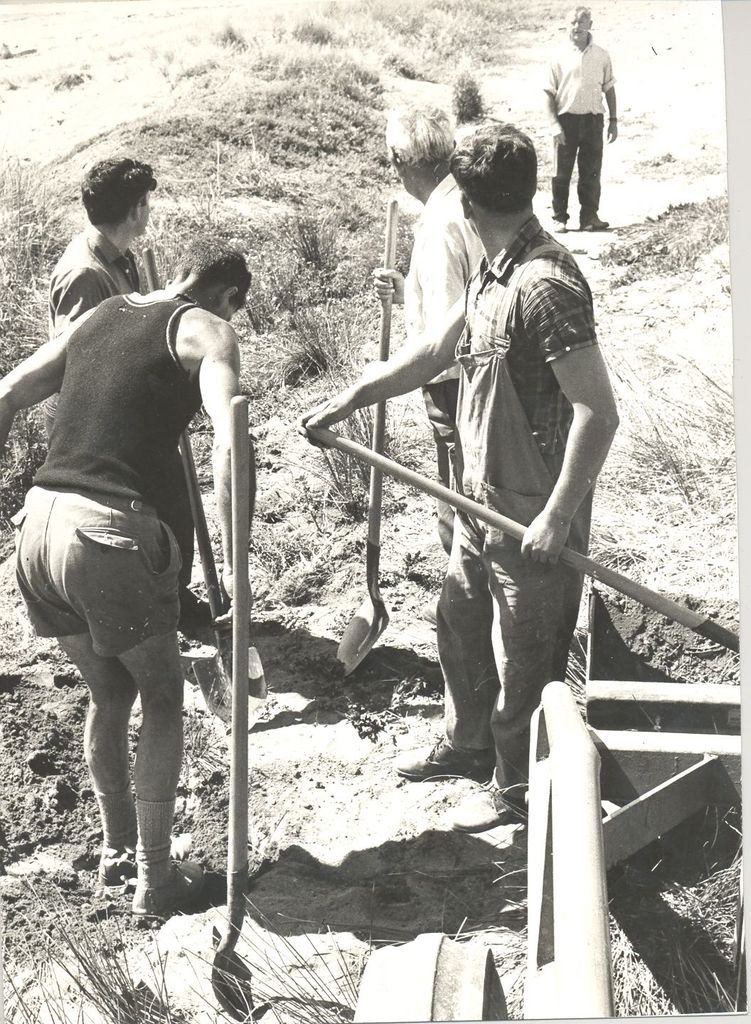 4 men (unidentified) planting groundcover plants ? along beach foreshore dunes. 1 B&W photo print