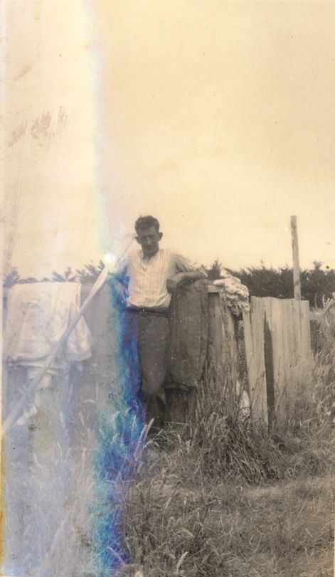 Young man leaning against a fence. Has he been boating? There is an oar leaning against the fence too.
