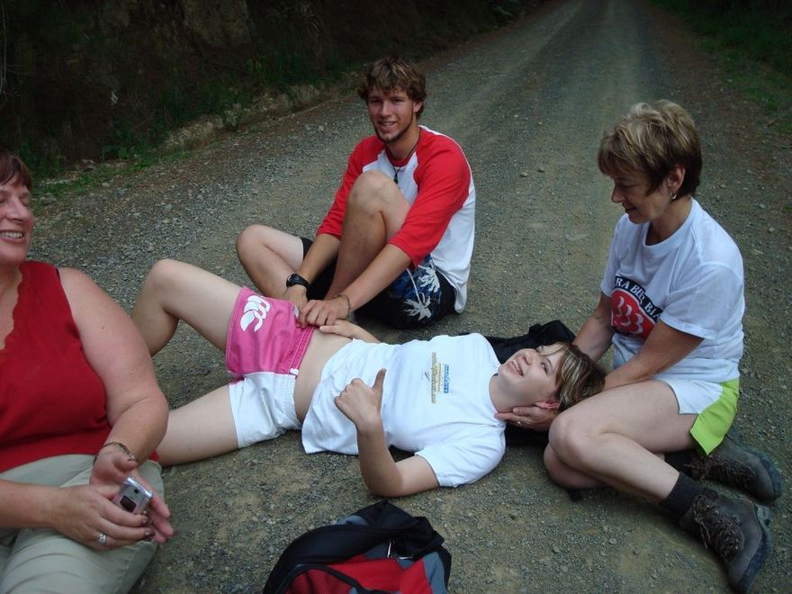 Meg dislocated her kneecap. We didn't try to move her, but called in the professionals and tried to keep her comfortable. At this point she was being very brave and could still muster a smile.