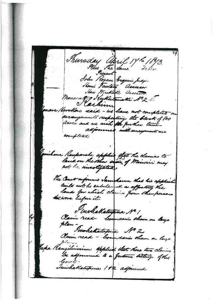 James Ransfield said – I wish the court to issue a certificate for this land in favor of Ngati Kapu – names of persons read.