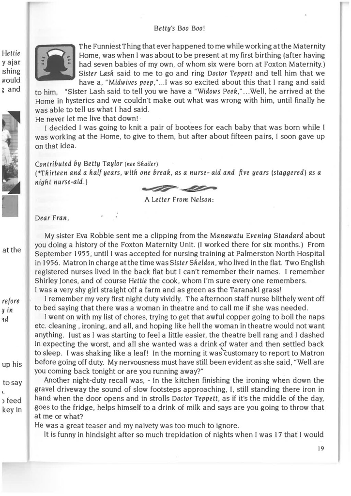 My sister Eva Robbie sent me ,a clipping from the Manawatu Evening Standard about you doing a history of the Foxton Maternity Unit. (I worked there for six months.) From September 1955, until I was accepted for nursing training at Palmerston North Hospital in 1956. Matron in charge at the time was Sister Sheldon, who lived in the flat. Two English registered nurses lived in the back flat but I can't remember their names. I remember Shirley Jones, and of course Hettie the cook, whom I'm sure every one remembers. I was a very shy girl straight off a farm and as green as the Taranaki grass!I remember my very first night duty vividly. The afternoon staff nurse blithely went off to bed saying that there was a woman in theatre and to call me if she was needed.