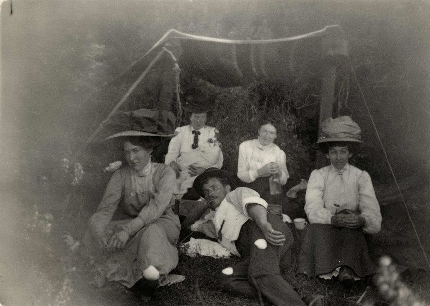 Group (unidentified) 4 women, baby & man on picnic