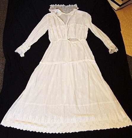 White georgette, embroidered frock. Long sleeves, a shawl collar and a hook and eye fastening top.