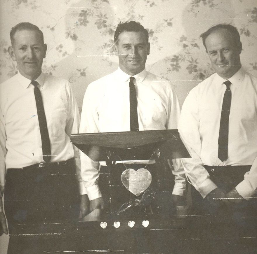 Mr D. Trotter (centre), president of the Shannon Lions Club, with Mr K. Tritt (left) and Mr R. Vinsen (right) with the lecturn to be held for organising the most outstanding project of the year – its Industries Fair & Lions Week. 1 B&W photo print