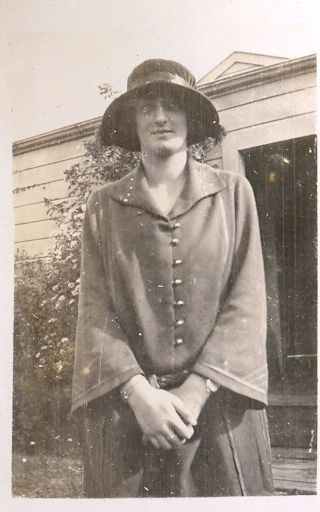 Photograph of a lady standing outside a building. Probably on a cold day as she is wearing a coat and hat.