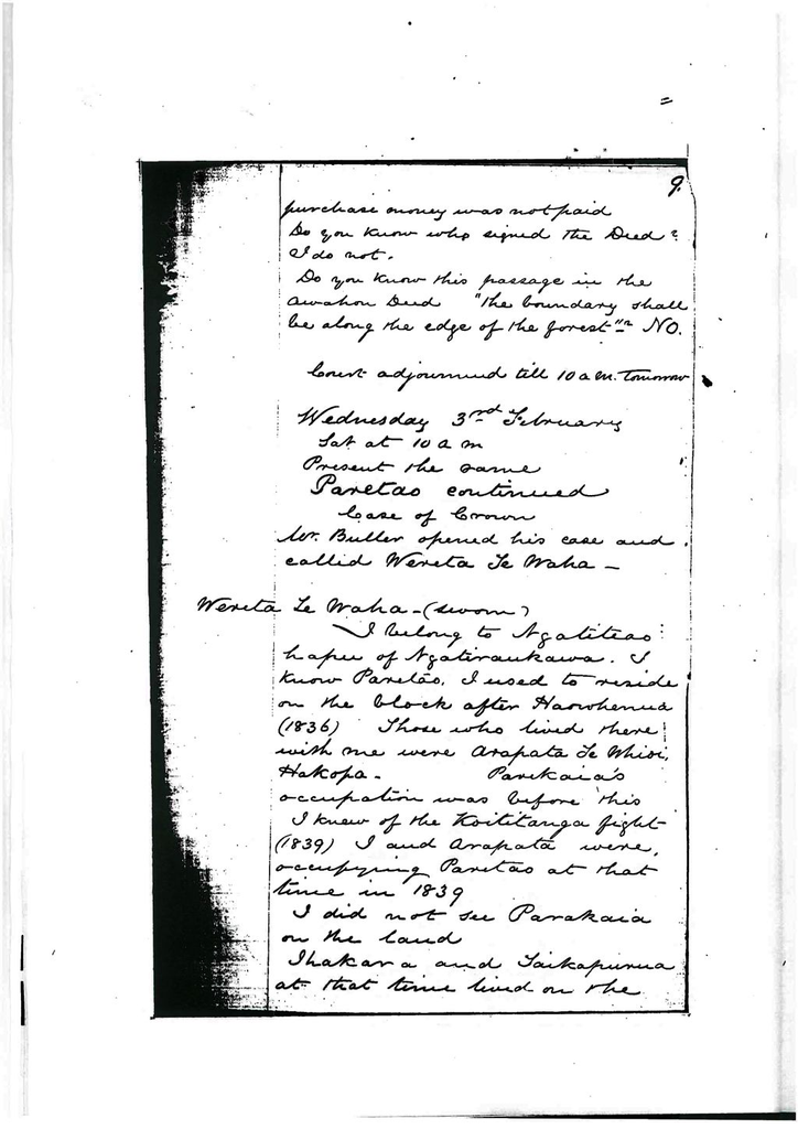 Wereta, Arapata, and Hakopa continued to live permanently on the block till the time of the sale. Paretao was not reserved when we offered the Awahou. In consequence of Wereta’s opposition the reserve was made. I consented. When the money was being divided I stood on a table and said, here is £100 for Wereta for Paretao but Wereta refused it.