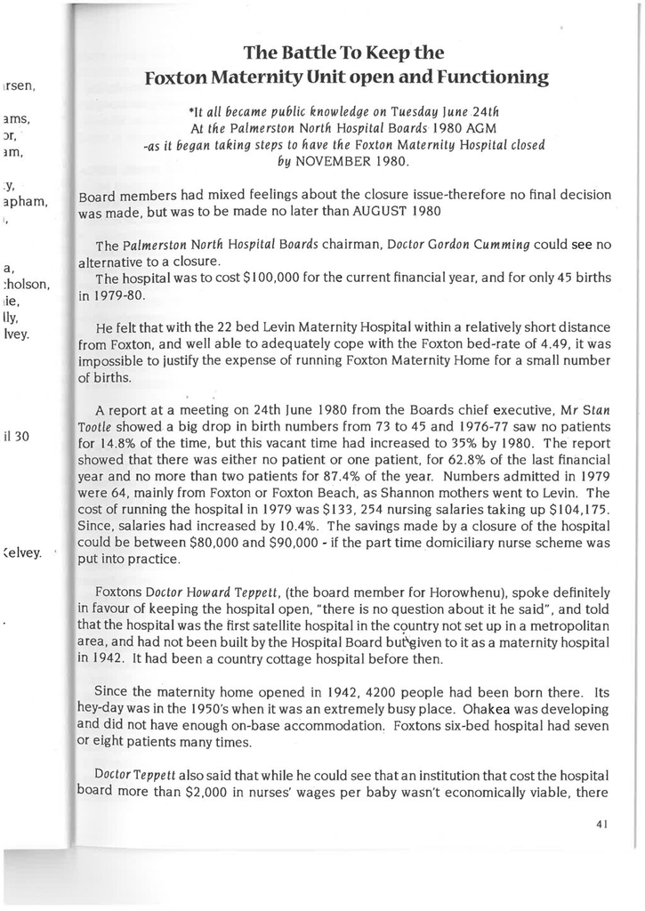Foxton's Doctor Howard Teppett, (the board member for Horowhenu), spoke definitely in favour of keeping the hospital open, "there is no question about it he said", and told that the hospital was the first satellite hospital in the country not set up in a metropolitan area, and had not been built by the Hospital Board but given to it as a maternity hospital in 1942. It had been a country cottage hospital before then.