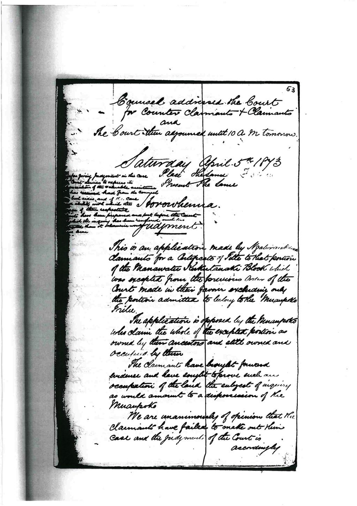 We find further that Te Whatanui acquired by gift from Muaupoko a portion of land at Raumatangi and we consider that this claim at Horowhenua will be fairly and substantially recognized by markings off a block of 100 acres at that place for which a certificate of title may be ordered in favor of his representatives.