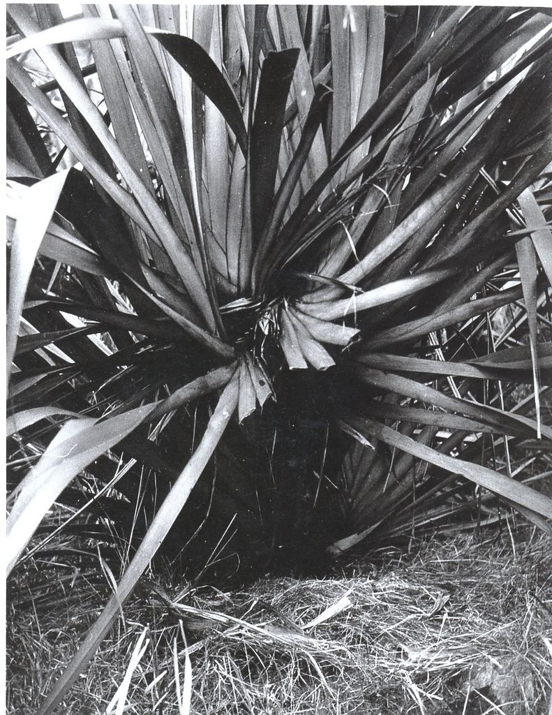 One of 9 photographs of flax (phormium tenax) and other plants taken by Uncle of Mrs M Illes. Close up of plant showing cut front of bush