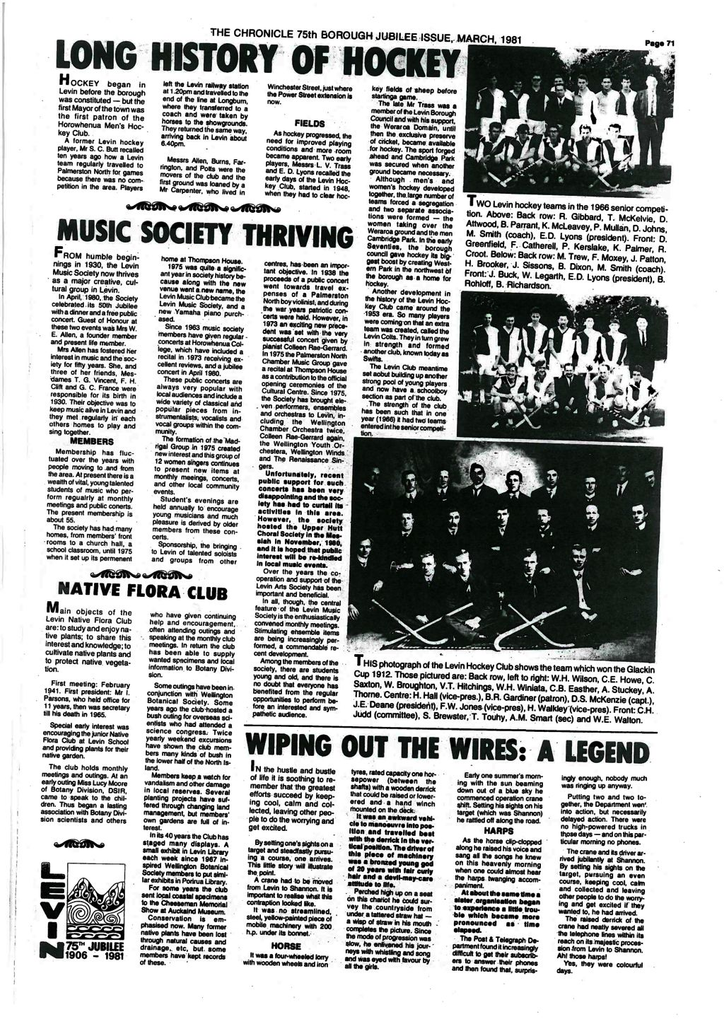 Hockey began in Levin before the borough was constituted-but the first Mayor of the town was the first patron of the Horowhenua Men's Hockey Club.