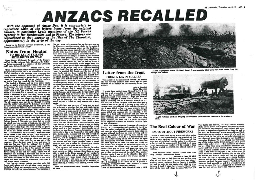 Notes from Hector McDonald to his Levin Friends - Sidelights on War From Hector McDonald, formerly of the literary staff of the Horowhenua Daily Chronicle, the following letter, addressed to a member of the Chronicle staff, came to hand yesterday: