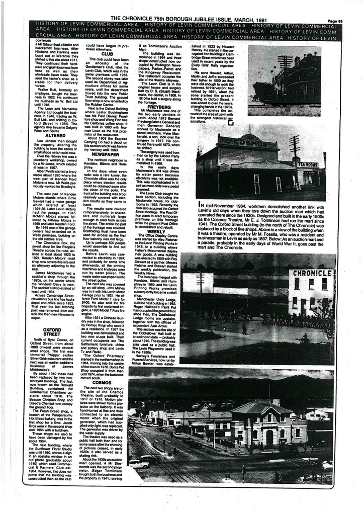 The Levin Club bought the back section, including the Mackenzie house, for clubrooms in 1953. Recently the club also acquired the Oxford street frontage. The Post Office plans to erect temporary premises on this frontage while the present Post Office is demolished and rebuilt.