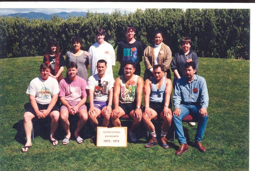 Printed on white board in wooden frame in photo, as group identification - Taitoko School 25th Reunion 1972 – 1974