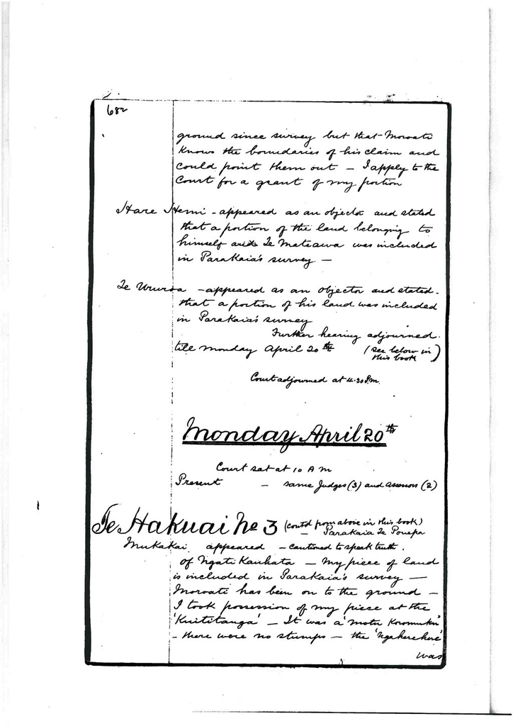 Rawiri Te Wanui appeared as objector alleging that Ngatipare had no land in the locality claimed and that the portion south of the boundary line agreed upon between Ngati mai Otaki and Ngati Te Ihi ihi encroached upon the lands of the former who were his co-claimants.