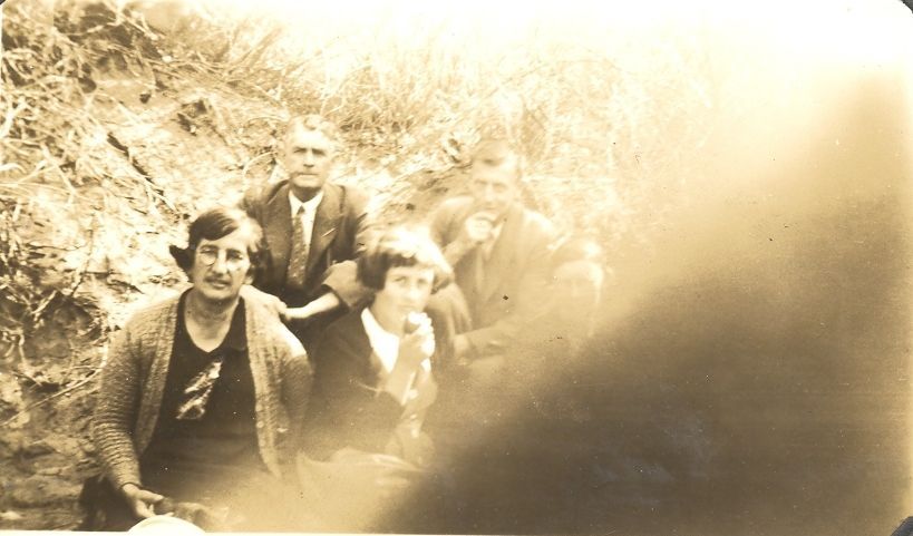 A group of people sitting in a sand dune or what looks like a sand dune, there is scrubby grass in the background. The photograph is blurred in the forground right hand corner.