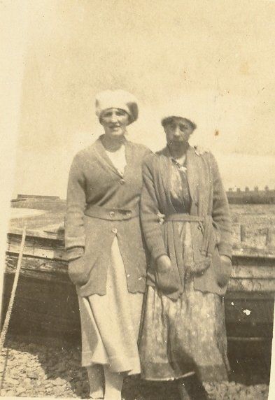 Two women at the beach. Behind them is a boat pulled up on the shore.