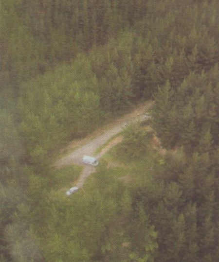 This is a view taken by the medic on the Rescue Helicopter, looking down to the track on trig. You can see the clearing where the chopper landed, and Megan with her support team lying just above the site.