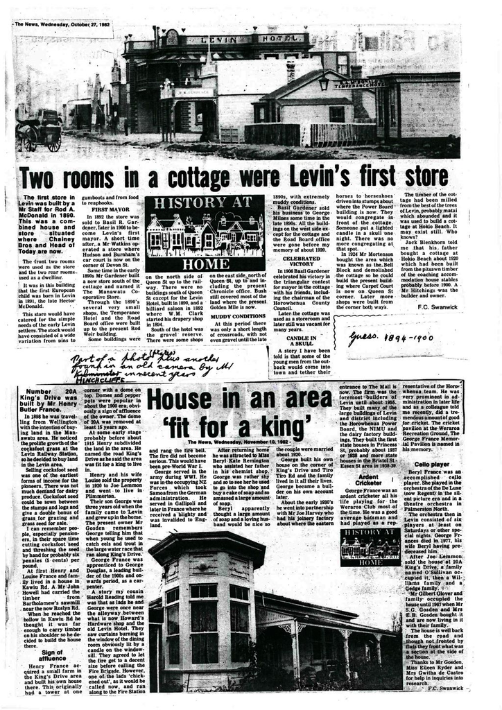 Their son George was three years old when the family came to Levin and grew up in the home. The present owner Mr Gosden remembers George telling him that when young he used to catch eels and trout in the large water race that ran along King’s Drive.