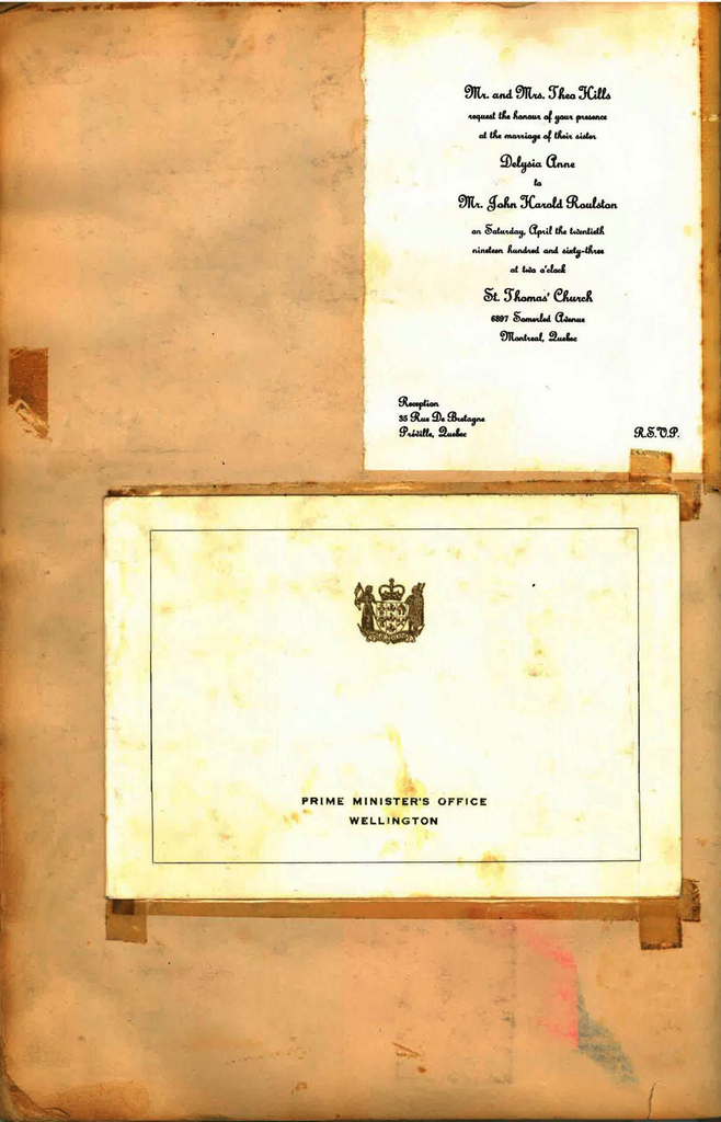 Mr & Mrs Theo Hills request the honour of you presance at the marriage of their sister, Delysia Ann to Mr John Harold Roulston on Saturday April the twentieth, nineteen hundred & sixty-three at two o'clock. St Thomas' Church 6897 Somerled Avenue montreal. Quebec. Reception 35 Rua De bretonge .