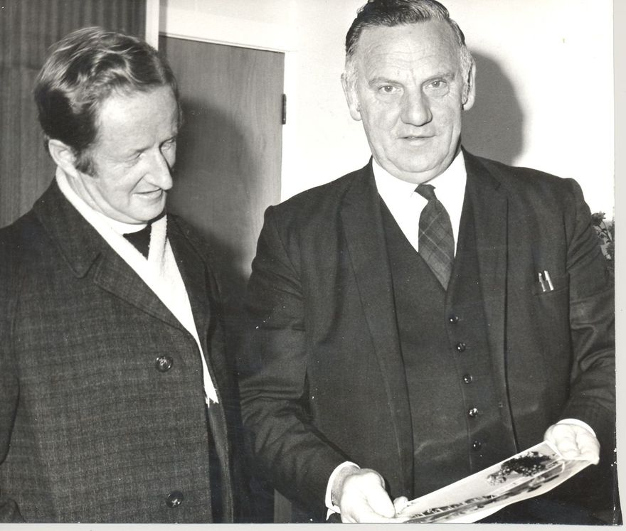 2 men (unidentified) with unframed photograph. 1 B&W photo print