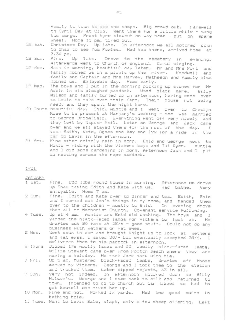 Johnny went with Percy Port to Y.M.C.A. - brought Maurice BecKett home with him. Nov. 5 Sat. Willie Stewart and family came over in evening for Guy Fawkes celebration. Nov. 6 Sun. Drove to Levin in afternoon to Becketts and brought Mrs B. and Winnie home again. Nov. 7 Mon. We all went to town in afternoon. I got woolpacks and Benzine etc. ready for shearing. Mr and Mrs W.G. Vickers up in evening - bridge. Nov. 9 Wed. Willie Stewart, Les Adkin, Mr Lancaster started to climb ranges From Otaki. Nov. 10 Thurs Mother and Winnie left for Wellington to stay at Fern Hill. Shirley and I went to Y.M.C.A. concert. Sang in male choir two items. Nov. 12 Sat. Went to town in evening. Took Mrs MacIntyre with us to see War Trophies. Nov. 14 - 19 Mon-Sat. Trouble with shearing machine, had to get parts from Auckland. Nov. 21 Mon. Shirley commenced today to supervise examinations at Levin school away all day. Left everything ready for shearers. Nov. 28 Mon. Shirley still supervising. I went down with Willie and W.G.A. to Levin to take part in reception for Lord Jellicoe. Good crowd of local residents and successful function. Lady Jellicoe opened Horticultural Show. Willie, the nippers and I had lunch with Billy Wilson intending to see aeroplane in afternoon but it failed to turn up, so home about 2 pm. Nov. 29 Tues. Took Holstein cow recently purchased from Ransfield back to yards, as she is not up to guarantee. Handed her to Rhodes and Ransfield refunded me 8 pounds. Nov. 30 Wed. Mort Ryder came to take delivery of 96 fats marked by Mr Vickers on Saturday. Dec. 2 Fri. Fine and very hot. Willie Stewart came to help me dock late Iambs. Dipped all Romney lambs in afternoon. Dec. 3 Sat. Went to town with Shirley. She called on Mrs Bryson. Dec. 4 Sun. Billy Wilson came up to ask me to help him muster his sheep for shearing. We all went in car. Dec. 6 Tues. Edith and Kate arrived from Wellington. Shirley and I drove down to meet them. Dec. 9 Fri. Fine and very hot. Shirley and I went by train to Palmerston Nth, Helen with us. Met Enid in Palmerston Nth as she is returning from school. Did a good deal of shopping, an enjoyable day. Home at 4.40 pm. Dec. 10 Sat. Jack away at Paikak. - C. of E. picnic. Dec. 11 Sun. All motored to Kuku to see Tom and Mrs Fowles in afternoon. Dec. 3 Tues. Enid and I drove to Levin in afternoon to do some business. Fixed up Accident Insurance 12/-. Dec. 14 Wed. Edith having bad time with her bad leg. Dec. 17 Sat. Shop day for Levin school. Went down to meet George home for holidays 10.45 train. Bought load of vegs. from the shop. Afternoon we all went to take Edith and Kate to Napier Mail for Wellington. Dec. 21 Wed. George helping Percy Port with hay. In afternoon I took Shirley to Levin school break-up. Afterwards to afternoon tea with Mr and Mrs McIntyre who will be retiring next year. Took Mrs Vickers with us. Afterwards went to Becketts, then home. Dec. 22 Thurs Family presented me with a birthday cake.