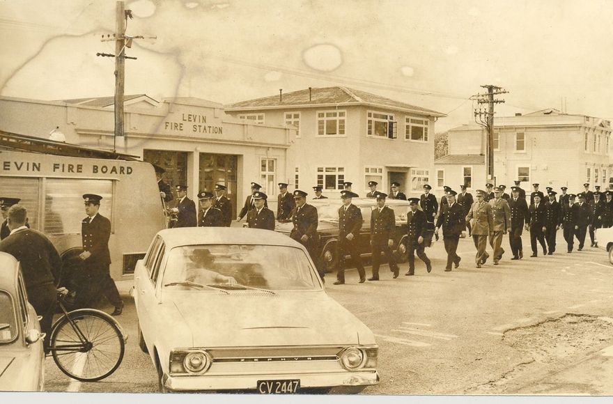 The Funeral Cortege for Fireman R.B. Trass, passes the Levin Fire Station.