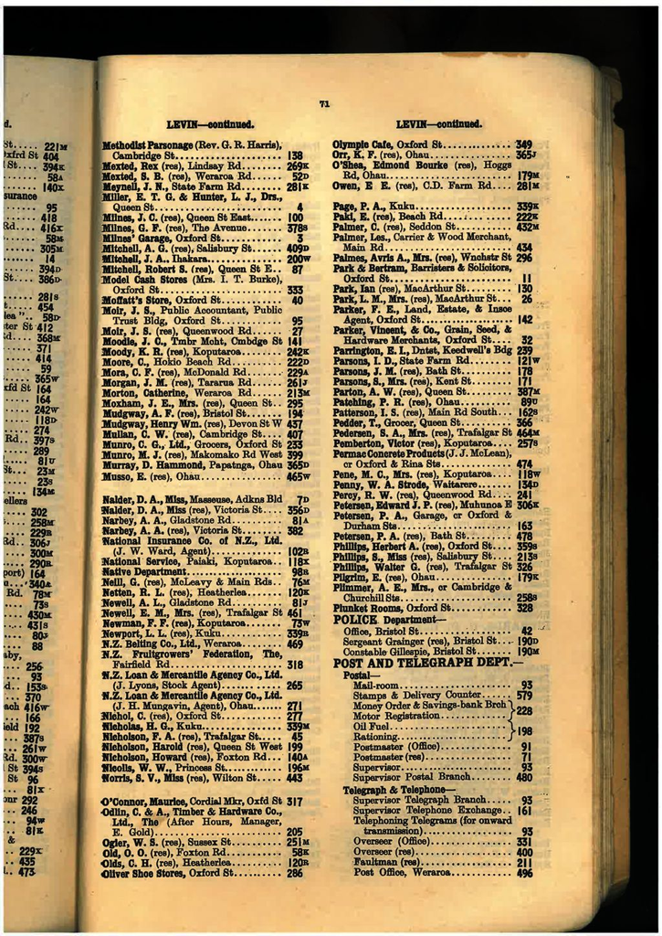 Name No. Methodist Parsonage (Rev. G. R. Harris), Cambridge St 138 Mexted, Rex (res), Lindsay Rd 269K Mexted, S. B. (res), Weraroa Rd 52D Meynell, J. N., State Farm Rd 281K Miller, E. T. G. & Hunter, L. J., Drs , 4 Queen St 4 Milnes, 1: C. (res), Queen St East 100 Milnes, G. F. (res), The Avenue 378S Milnes' Garage, Oxford St 3 Mitchell, A. G. (res), Salisbury St 409D Mitchell, J. A.. Ihakara. 200W Mitchell, Robert S. (res), Queen St E 87 Model Cash Stores (Mrs. I. T. Burke), Oxford St 333 Moffatt's Store, Oxford St 40 Moir J. S., Public Accountant, Public Trust Bldg, Oxford St 95 Moir, J. S. (res), Queenwood Rd 27 Moodie, J. 0., Tmbr Moht, Cmbdge St 141 Moody, K. R. (res), Koputaroa 242K Moore, C., Hokio Beach Rd 222D Mora, C. F. (res), McDonald Rd 229A 229A Morgan, J. M. (res), Tararua Rd 261J Morton, Catherine, Weraroa Rd 213M Moxham, J. E., Mrs. (res), Queen St 295 Mudgway, A. F. (res), Bristol St 194 Mudgway, Henry Wm. (res), Devon St W 437 Mullen, C. W. (res), Cambridge St 407 Munro, C. G., Ltd., Grocers, Oxford St 233 Munro, M. J. (res), Makomako Rd West 399 Murray, D. Hammond, Papatnga, Ohau 365D Musso, E. (res), Ohau 465W Nalder, D. A., Miss, Masseuse, Adkns Bld 7D Nalder, D. A., Miss (res), Victoria St . . 356D Narbey, A. A., Gladstone Rd 81A Narbey, A. A. (res), Victoria St 382 National Insurance Co. of N.Z., Ltd (J. W. Ward, Agent) 102R National Service, Paiaki, Koputaroa 118X Native Department 98R Neill, G. (res), MoLeavy & Main Rds 76M Notion, R. L. (res), Heatherlea 120K Newell, A. L., Gladstone Rd 81J Newell, E. M., Mrs. (res), Trafalgar St 461 Newman, F. F. (res), Koputaroa 73W Newport, L. L. (res), Kuku 339R N.Z. Belting Co., Ltd., Weraroa 469 N.Z. Fruitgrowers' Federation, The, Fairfield Rd 318 N.Z. Loan & Mercantile Agency Co., Ltd (J. Lyons, Stock Agent) 265 N.Z. Loan & Mercantile Agency Co., Ltd (J. H. Mungavin, Agent), Ohau 271 Nichol, C. (res), Oxford St 277 Nicholas, H. G., Kuku 339M Nicholson, F. A. (res), Trafalgar St 45 Nicholson, Harold (res), Queen St West 199 Nicholson, Howard (m), Foxton Rd 140A Nicolls, W. W., Princess St 196M Norris, S. V., Miss (res), Wilton St 443 O'Connor, Maurice, Cordial Mkr, Oxfd St 317 Odlin, C. & A., Timber & Hardware Co., Ltd., The (After Hours, Manager, E. Gold)Ltd., The (After Hours, Manager, E.Gold) 205 Ogler, W. S. (res), Sussex St Old, 0. 0. (res), Foxton Rd 58K Olds, C. H. (res), Heatherlea 129R Oliver Shoe Stores, Oxford St 286 Olympic Café, Oxford St 349 Orr, K.F. (res) Ohau 365J O,Shea, Edmond Bourke (res), Hoggs Rd, Ohau 179M Owen, E E. (res), C.D. Farm Rd 281M Page, P. A., Kuku 339K Paki, E. (res), Beach Rd 222K Palmer, C. (res), Seddon St 432M Palmer, Les., Carrier & Wood Merchant, Main Rd 434 Paimes, Avris A., Mrs. (res), Wnchstr St 296 Park & Bertram, Barristers & Solicitors, Oxford St 11 Park, Ian (res), MacArthur St 130 Park, L. N., Mrs. (res), MacArthur St 26 Parker, F. E., Land, Estate, & Insce Agent, Oxford St 142 Parker, Vincent, & Co., Grain, Seed, & Hardware Merchants, Oxford St 32 Parrington, E. I., Dntst, Keedwell's Bdg 239 Parsons, I. D., State Farm Rd 121W Parsons, J. M. (res), Bath St 178 Parsons, S., Mrs. (res), Kent St 171 Parton, A W (res), Queen St 387M Patching, P. R. (res), Ohau 89U Patterson, I. S. (res), Main Rd South. 162S Pedder, T., Grocer, Queen St 366 Pedersen, S. A., Mrs. (res), Trafalgar St 464M Pemberton, Victor (res), Koputaroa 257S Permac Concrete Products (J. J. McLean), cr Oxford & Rina Sts 474 Pene, M. C., Mrs. (res), Koputaroa 118W Penny, W. A. Strode, Waitarere 134D Percy, R. W. (res), Queenwood Rd.. 241 Petersen, Edward I. P. (res), Muhunoa E 306K Petersen, P. A., Garage, or Oxford & Durham Sts 163 Petersen, P. A., (res) Bath St 478 Phillips, Herbert A. (res), Oxford St 359S Phillips, S., Miss (res), Salisbury St.. 213S Phillips, Walter G. (res), Trafalgar St 326 Pilgrim, E. (res), Ohau 179K Pllmmer, A. E., Mrs., or Cambridge & Churchill Sts 258S Plunket Rooms, Oxford St 328 POLICE Department Office, Bristol St 42 Sergeant Grainger (res), Bristol St 190D Constable Gillespie, Bristol St 190M POST AND TELEGRAPH DEPT.— Postal- Mailroom 93 Stamps & Delivery Counter 579 Money Order & Savings-bank Brch 228 Motor Registration 288 Oil Fuel 198 Rationing 198 Postmaster (office) 91 Postmaster (res) 71 Supervisor 93 Supervisor Postal Branch 480 Telegraph & Telephone— Supervisor Telegraph Branch 93 Supervisor Telephone Exchange 161 Telephoning Telegrams (for onward transmission) 93 Overseer (Office) 331 Overseer (res) 400 Faultman (res) 211 Post Office, Weraroa 496