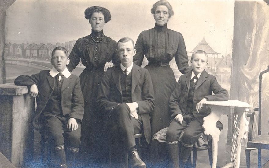 Family group of five. Stewart is in the middle of the front row and Aunt Nell is on the right at the rear.