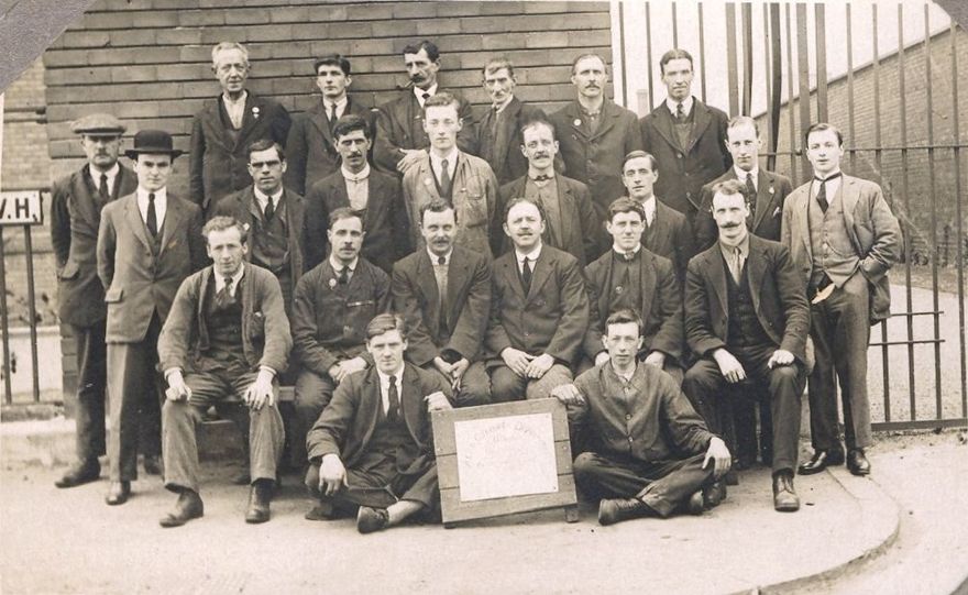 Group of men taken outside a building (munitions factory perhaps) Plaque in centre front of photo not decipherable. 1914 – 1918.