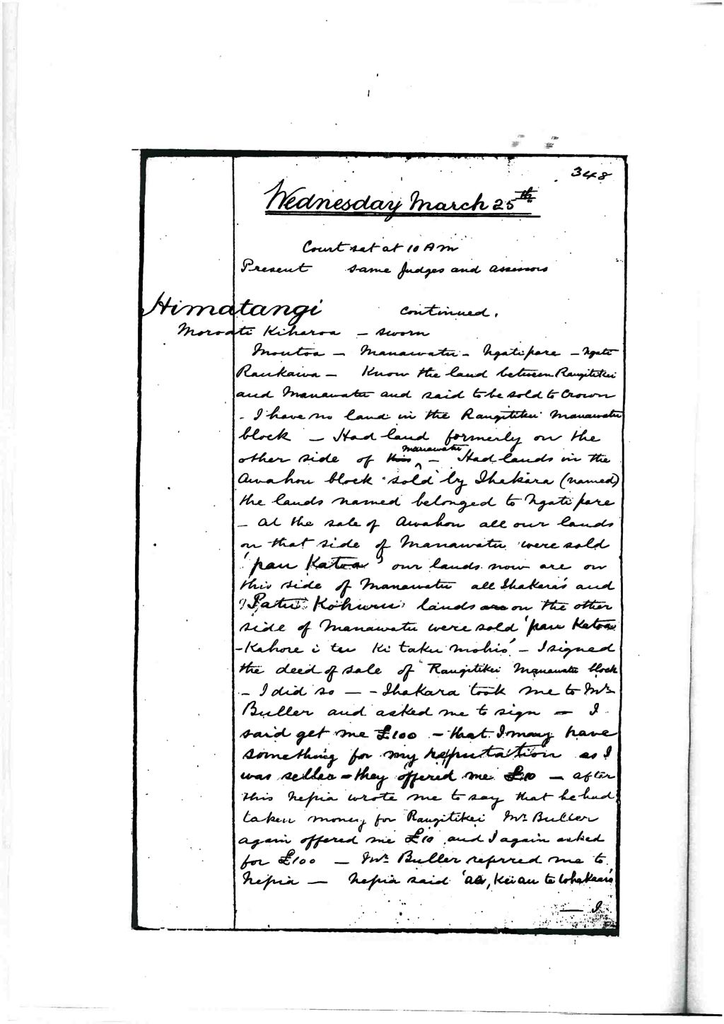 Moutoa – Manawatu – Ngati Pare – Ngatiraukawa – know the land between Rangitikei and Manawatu and said to be sold to crown – I have no land in the Rangitikei – Manawatu block – had land formerly on the other side of Manawatu – had lands in the Awahou block sold by Ihakara (named) the lands named belonged to Ngati Pare – at the sale of Awahou all our lands on that side of Manawatu were sold ‘pou katoa’ – our lands now are on this side of Manawatu all Ihakara’s and Patu Kohuru lands on the other side of Manawatu were sold ‘pou katoa’ – ‘kahore I tu ki taku mohio’ – I signed the deed of sale of Rangitikei Manawatu block – I did so – Ihakara took me to Mr. Buller and asked me to sign – I said get me £100 – that I may have something for my reputation as I was seller – they offered me £10 – after this Nepia wrote me to say that he had taken money for Rangitikei – Mr. Buller again offered me £10 and I again asked for £100 – Mr. Buller referred me to Nepia – Nepia said ‘ae, kei au te whakaaro’Page 349