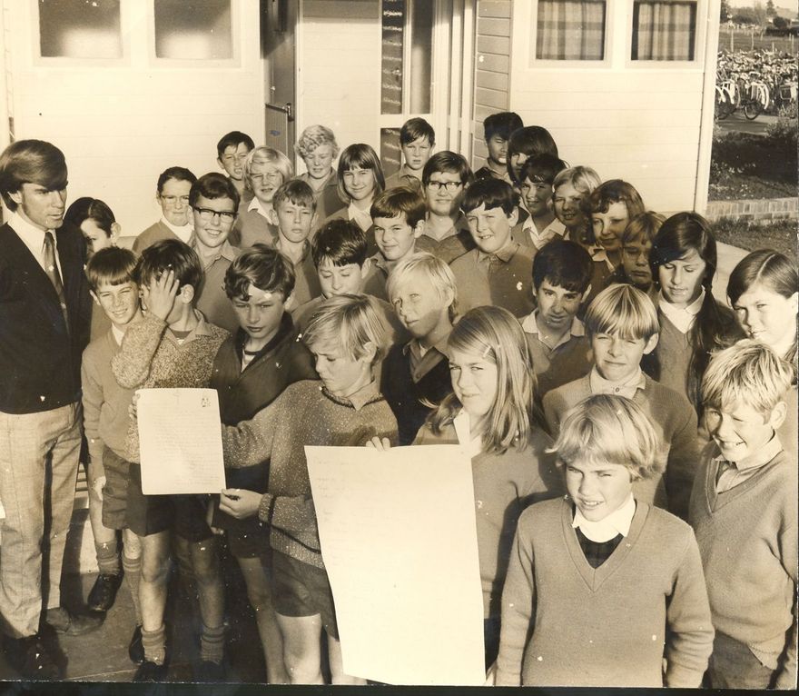 Penciled on back - Members of a class of Levin Intermediate School who have “adopted” an 11 yr old Sth Vietnamese boy through World Vision. With them, teacher Mr L.R. McKinney. Tues. June 1, 1971.