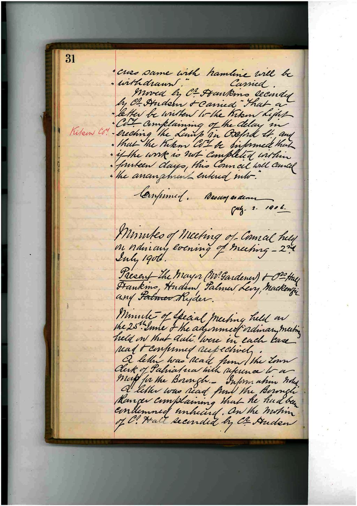 Moved by the Mayor seconded by Cr Hall and carried – “That this council hereby resolved to borrow from its Bankers, the Bank of Australasia, Levin, the sum of six hundred and fifty six pounds sterling (or such portion thereof as may from time to time be required) by way of overdraft – in anticipation of revenue receivable from the following sources : viz General Rate for yearly period (ending 31 March 1907 of 1 ¼ d. in the £ on the Capital value of £101,000 - £526, Government subsidy thereon £130, Total £656”