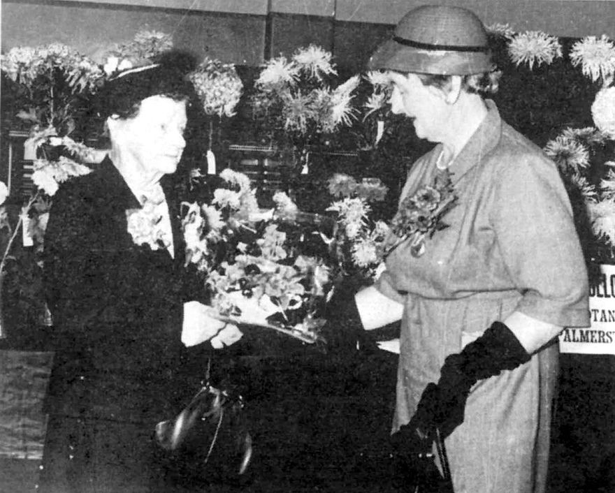 Former postmistress and mayoress of Levin, Miss Daisy Bowen photographed at a 1957 Chrysanthemum Show with Mrs K.Z. Lynch, the Levin Horticultural Society's president in that year.