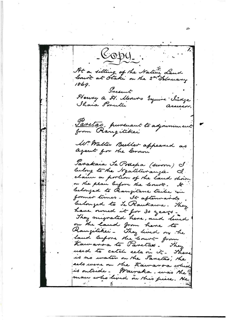 Deed of cession of Paretao handed in to court by Mr. Buller.