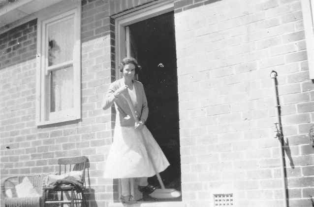 Cleaning house. A Sutton woman at her door with a broom.